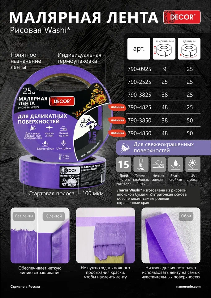 Лента изготовлена из рисовой японской бумаги. Ультратонкая основа обеспечивает самые ровные окрашенные края. Предназначена для работ на чувствительных поверхностях, таких как обои, лак и глазури. Идеально подходит для шпатлевки и окраски, а также для водоразбавляемых материалов. Низкая адгезионная прочность с очень высокой прочностью во влажном состоянии. Не оставляет следов до 15 дней.