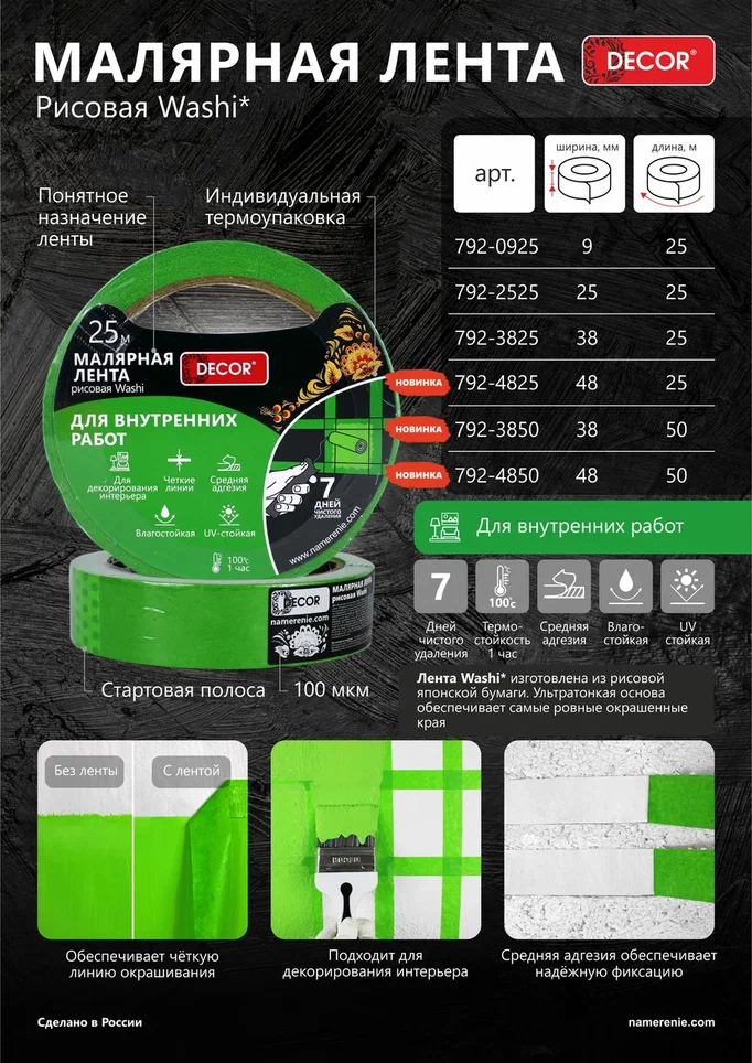 Лента Малярная DЕCOR 9 мм х 25 м, зелёная для внутр. работ, 7дн. Лента изготовлена из рисовой японской бумаги. Ультратонкая основа обеспечивает самые ровные окрашенные края. Предназначена для работ на чувствительных поверхностях, таких как обои, лак и глазури. Идеально подходит для шпатлевки и окраски, а также для водоразбавляемых материалов. Низкая адгезионная прочность с очень высокой прочностью во влажном состоянии. Не оставляет следов до 15 дней.
