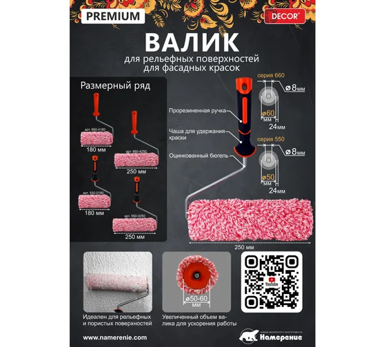 Валик DECOR 2К-ручка d 50 мм, бюгель 8 мм, ворс 24 мм, полиакрил премиум имеет покрытие из полиакрила премиального качества с высотой ворса 24 мм. Применяется для обработки поверхностей (грунтование, нанесение ЛКМ) в строительстве. Данный вид ворса идеален для обработки шероховатых поверхностей.