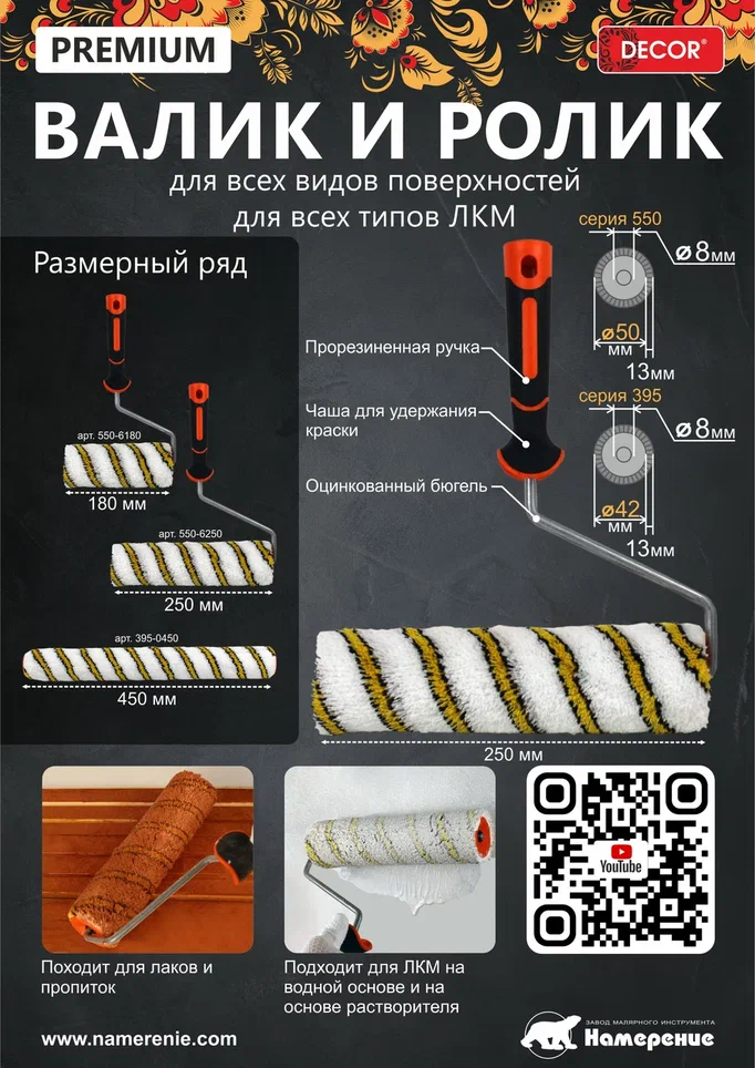 Валик "PROFI" полиамид 180 мм, d42 мм, бюгель 8 мм, ворс 12 мм подходит для нанесения красок, лаков, пропиток, грунтовок и других ЛКМ. Шубка из качественного полиамида не оставляет ворса на поверхности, обладает отличной впитываемостью и гладкостью нанесения. Эргономичная рукоятка обеспечивает комфортную эксплуатацию.