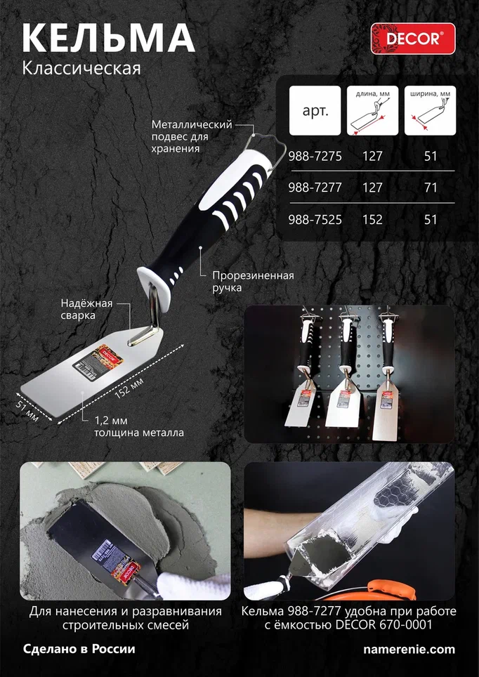 Кельма DECOR классическая 127*51 мм, толщина 1,2 мм. Кельма классическая с эргономичной двухкомпонентной ручкой для работы с сухими смесями. Сделана из нержавеющей полированной стали 1,2мм. Долговечный специализированный инструмент, при помощи которого можно проводить выравнивание растворов. Имеется удобная бочкообразная рукоятка - хорошо ложится в ладонь. Полотно надежно закреплено - основание рукоятки приварено и зачищено, что обеспечивает отсутствие следов на штукатурке. Инструмент обладает хорошей прочностью, устойчив к коррозии и деформации.