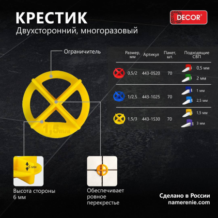Крестик DECOR двусторонний 1/2.5 мм 70 шт/пакет,используются во время укладки кафельной плитки.