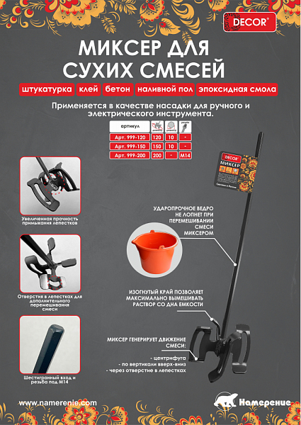 Миксер DECOR для сухих смесей d20 см, L 580 мм, М14