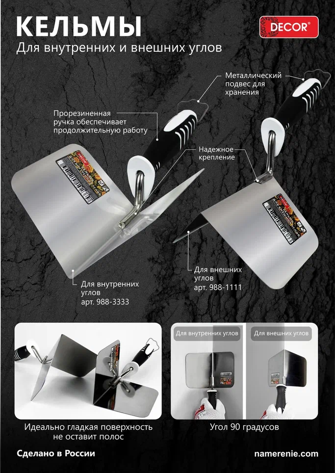 Кельма DECOR для внутренних углов.Удобная кельма с эргономичной двухкомпонентной ручкой для работы с сухими смесями. Сделана из нержавеющей полированной стали 1,2мм. Долговечный специализированный инструмент, при помощи которого можно проводить выравнивание растворов. Имеется удобная бочкообразная рукоятка - хорошо ложится в ладонь. Полотно надежно закреплено - основание рукоятки приварено и зачищено, что обеспечивает отсутствие следов на штукатурке. Инструмент обладает хорошей прочностью, устойчив к коррозии и деформации.