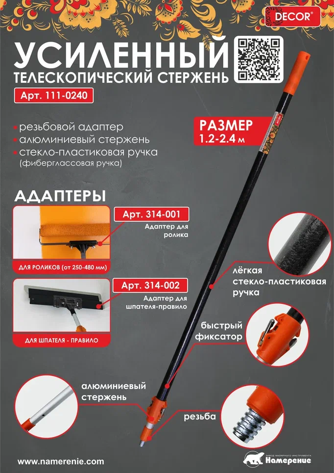 DECOR Телескопический стержень усиленный резьба, 1,2-2,4м. Высококачественный усиленный стержень для большинства валиков. Удобная резьба, прочный материал ручки. Выдвигается до 2,4 метров, удобен в использовании для малярных работ.