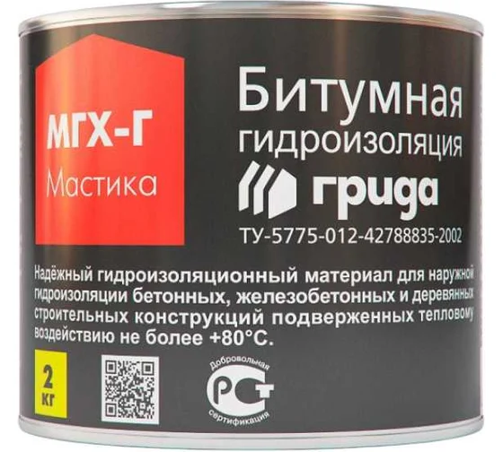 Мастика битумная МГХ-Г 2кг (Грида) используется в качестве обмазочной гидроизоляции и для приклеивания рулонных битумных гидроизоляционных материалов с целью защиты строительных конструкций от влаги и грунтовых вод. Применяется для наружной гидроизоляции заглубляемых в землю бетонных, железобетонных и деревянных строительных и промышленных конструкций (фундаменты, сваи и др.).