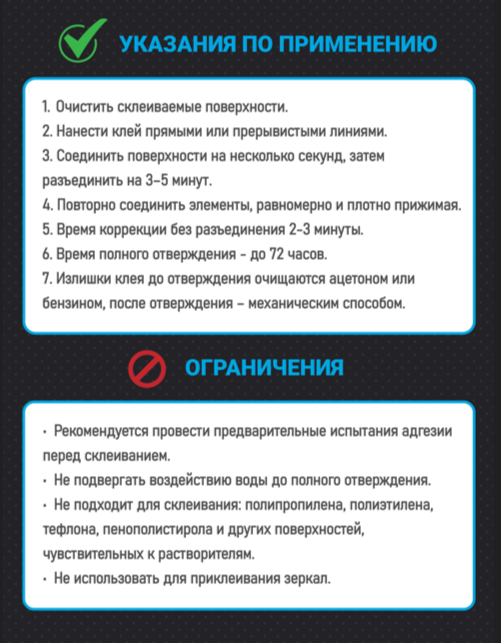 Способ применения: Основания очистить, обезжирить, высушить. Клей нанести на одну из склеиваемых поверхностей точечно или полосами. Склеиваемые поверхности соединить, затем рассоединить, подождать около 5-10 минут и соединить повторно, сильно и равномерно прижимая. Склеенные поверхности оставить в контакте на время полного отверждения клея.