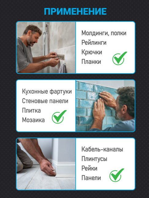 Клей предназначен для приклеивания различных элементов конструкций и отделочно-декоративных деталей. Образует кристально-прозрачный влагостойкий эластичный шов.