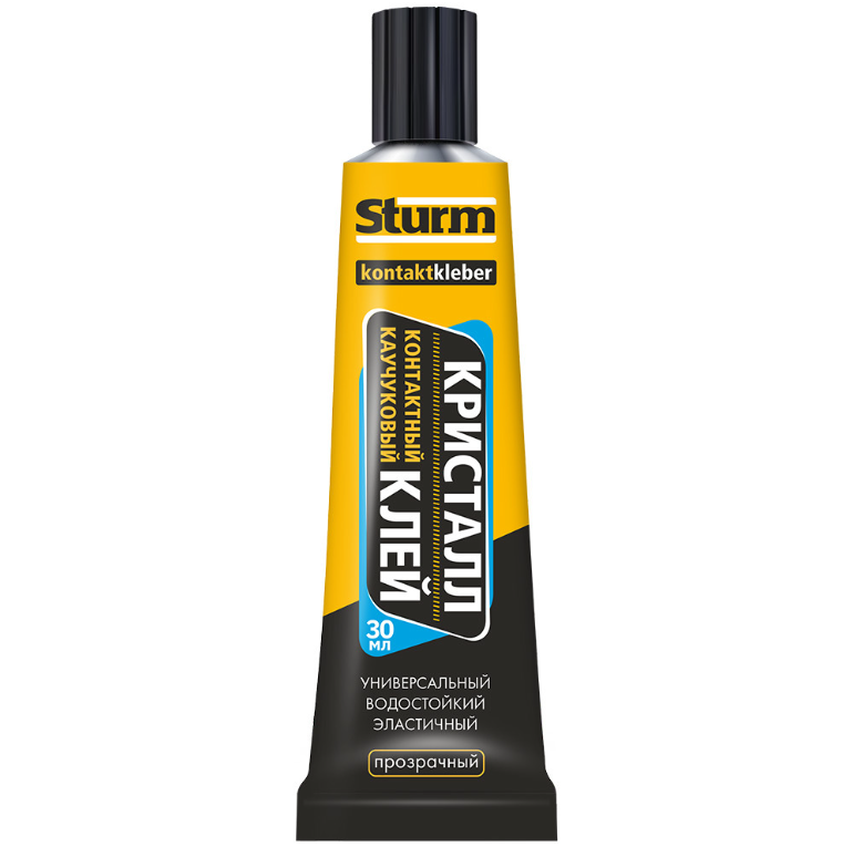 Клей контактный STURM КРИСТАЛЛ прозрачный 30 мл, в шоу-боксе, предназначен для склеивания мягкого и жесткого поливинилхлорида, полистирола, оргстекла и других пластиков, в различных сочетаниях склеивает дерево, металл, резину, бумагу, картон, кожу, ткань, пробку, поролон, фарфор, керамику, стекло, кроме посуды, контактирующей с пищей.