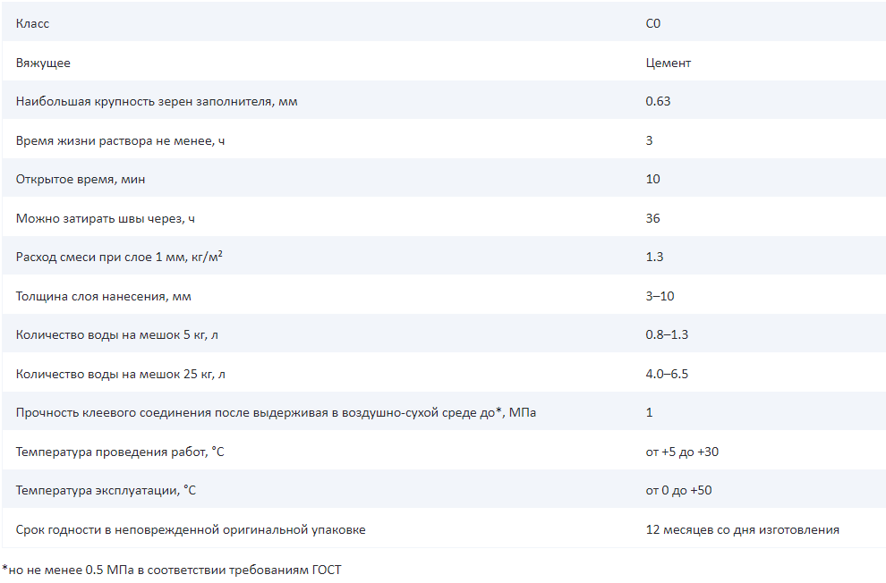 Смесь сухая строительная клеевая С0, ГОСТ Р 56387. Изготовлена на основе цементного вяжущего, минеральных наполнителей, фракционированного песка и модифицирующих добавок, улучшающих эксплуатационные свойства.