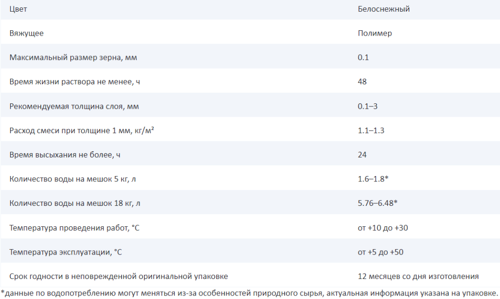 Сухая смесь на основе полимерного вяжущего, минеральных тонкодисперсных наполнителей и модифицирующих добавок, улучшающих эксплуатационные свойства. Для внутренних работ в сухих помещениях.