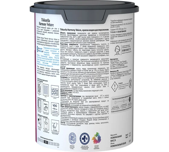 Интерьерная краска HARMONY (гл/мат) БазаС (под колеровку в насыщенные тона) Tikkurila - краска для стен и потолков в сухих помещениях. Создает элегантное глубокоматовое покрытие с бархатистым эффектом. Предназначена для окраски новых и ранее окрашенных оштукатуренных, бетонных, зашпатлеванных, кирпичных, деревянных и гипсокартонных поверхностей, а также древесностружечных и древесноволокнистых плит внутри помещений, в т.ч. в детских дошкольных, учебных, лечебно-профилактических учреждениях и других помещениях с предусмотренным режимом влажной дезинфекции. Не подходит для окраски дверей и мебели. Применяется для окраски стен и потолков в сухих помещениях с умеренной эксплуатационной нагрузкой, например спальни, кабинеты и зоны отдыха.